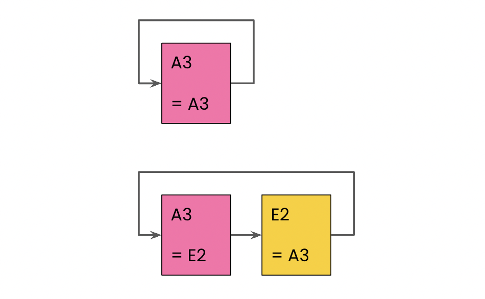 This behavior is incredibly useful in most cases, but it open up the possibility of creating circular references. A circular reference directly, or via a chain of other references, refers to itself: